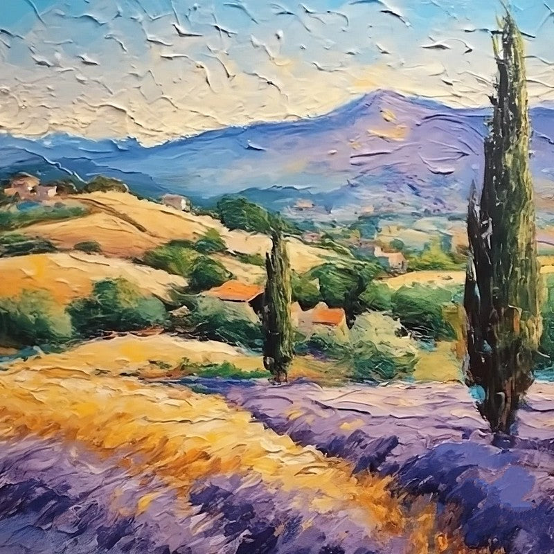 Original Small Landscape Paintings, Provence Lavender Field Cypress Tree Painting, Simple Small Canvas Paintings, Heavy Texture Acrylic Artwork, Easy Landscape Painting Ideas