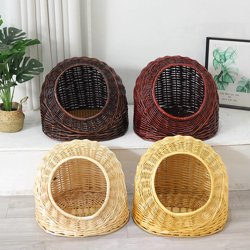 Hand woven Rattan Cat Bed, Natural Wicker Cat House Basket with Washable Cushion for Indoor Cats and Dogs