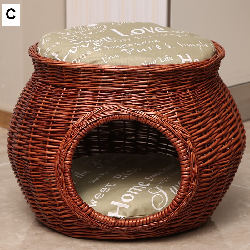 Wicker Cat House Basket with Washable Cushion for Indoor Cats and Dogs, Rattan Cat Bed