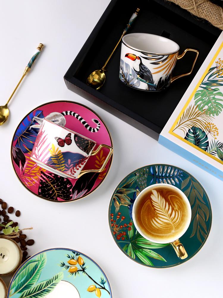 Elegant Porcelain Coffee Cups, Coffee Cups with Gold Trim and Gift Box, Tea Cups and Saucers, Jungle Animal Porcelain Coffee Cups