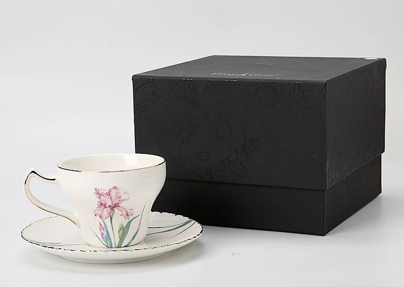 Iris Flower British Tea Cups, Beautiful Porcelain Tea Cup Saucer Set, Traditional English Tea Cup and Saucer, Unique Ceramic Coffee Cups in Gift Box